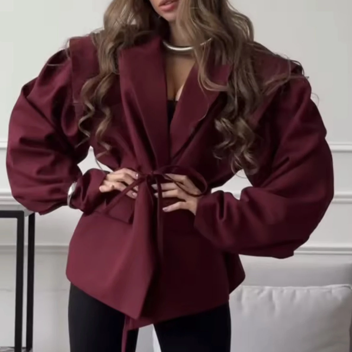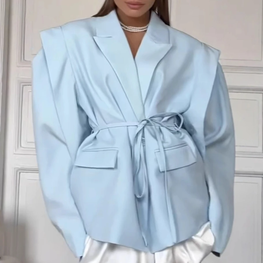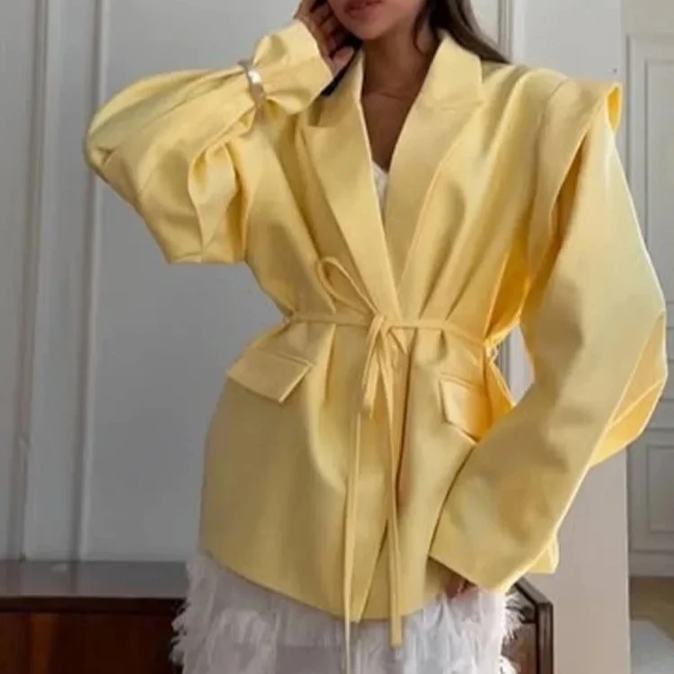 Lace up Shoulder Pad Blazer Coat Women Chic Ladies Commute Outerwear Elegant Turn-down Collar Long Sleeve Pockets Slim Fit Coats